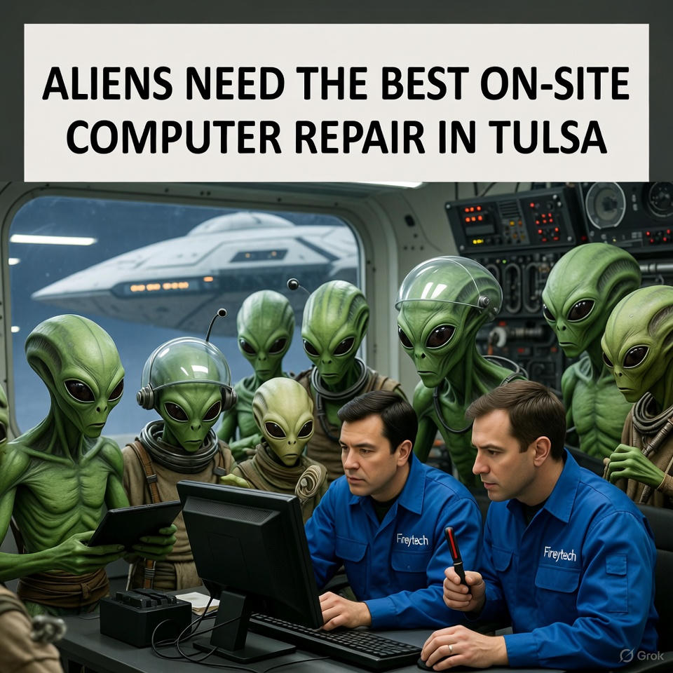 Even aliens choose Fireytech for on-site repair in Tulsa — because nobody wants the mothership to crash over one shady “Earth Girls are Easy” video click. From virus removal to upgrading from Windows 10, we’ve got the galaxy covered. Call 918-258-FIRE before the Vogons arrive! 👽🔧🚀