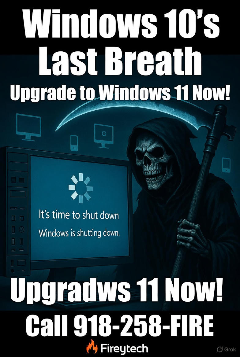 Windows 10 support ended October 2025 — no more security updates EVER (unless you pay Microsoft yearly). Upgrade to Windows 11 with full data transfer for only $99 (limited time!). Same/next-day service. Call Fireytech 918-258-FIRE before the hackers notice! 🛑➡️ Windows 11 🚀